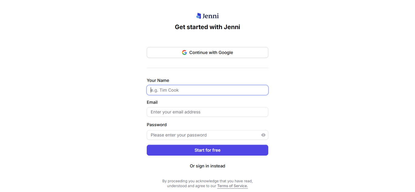 Alt text: Jenni ai login page to get started.